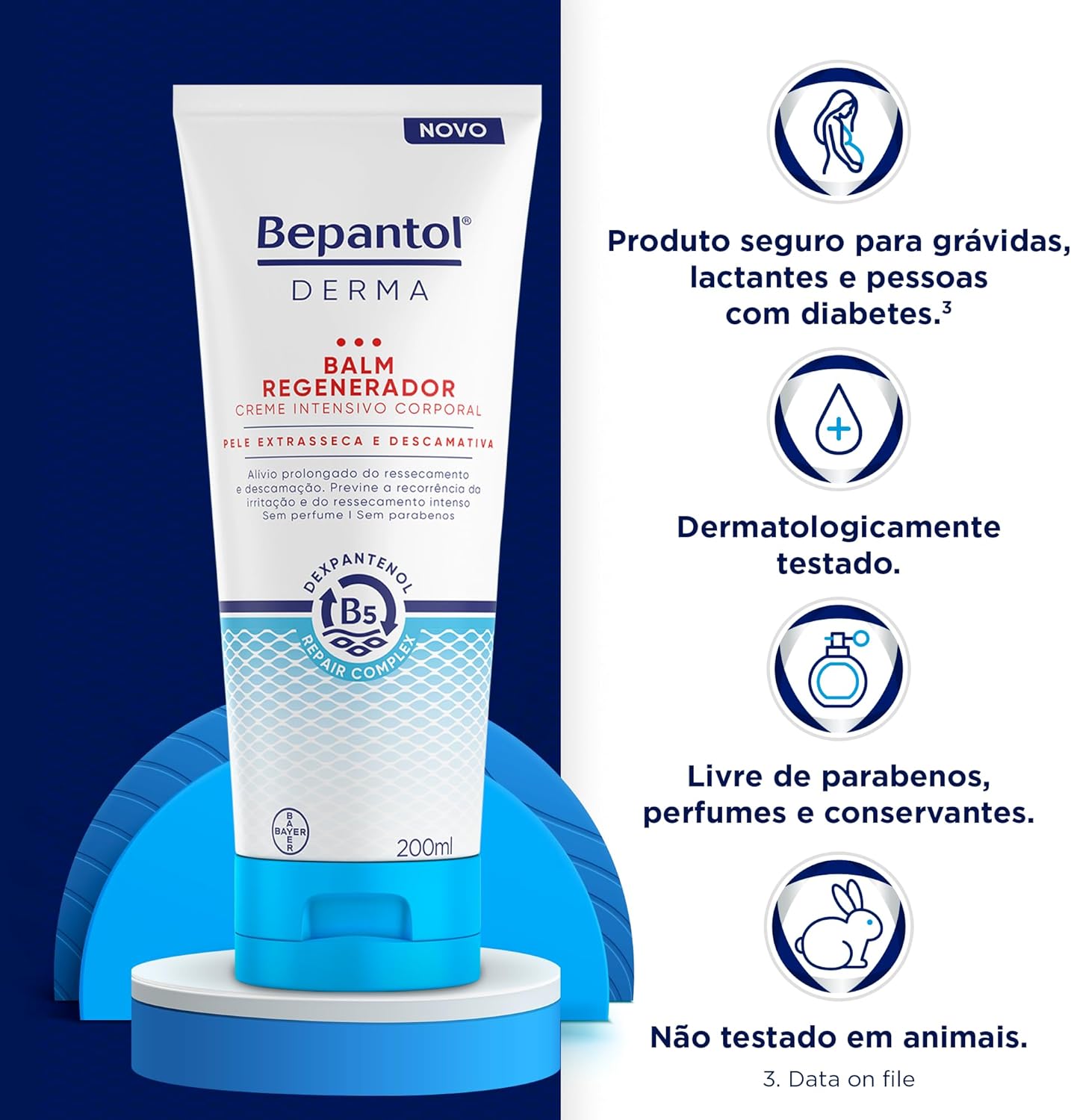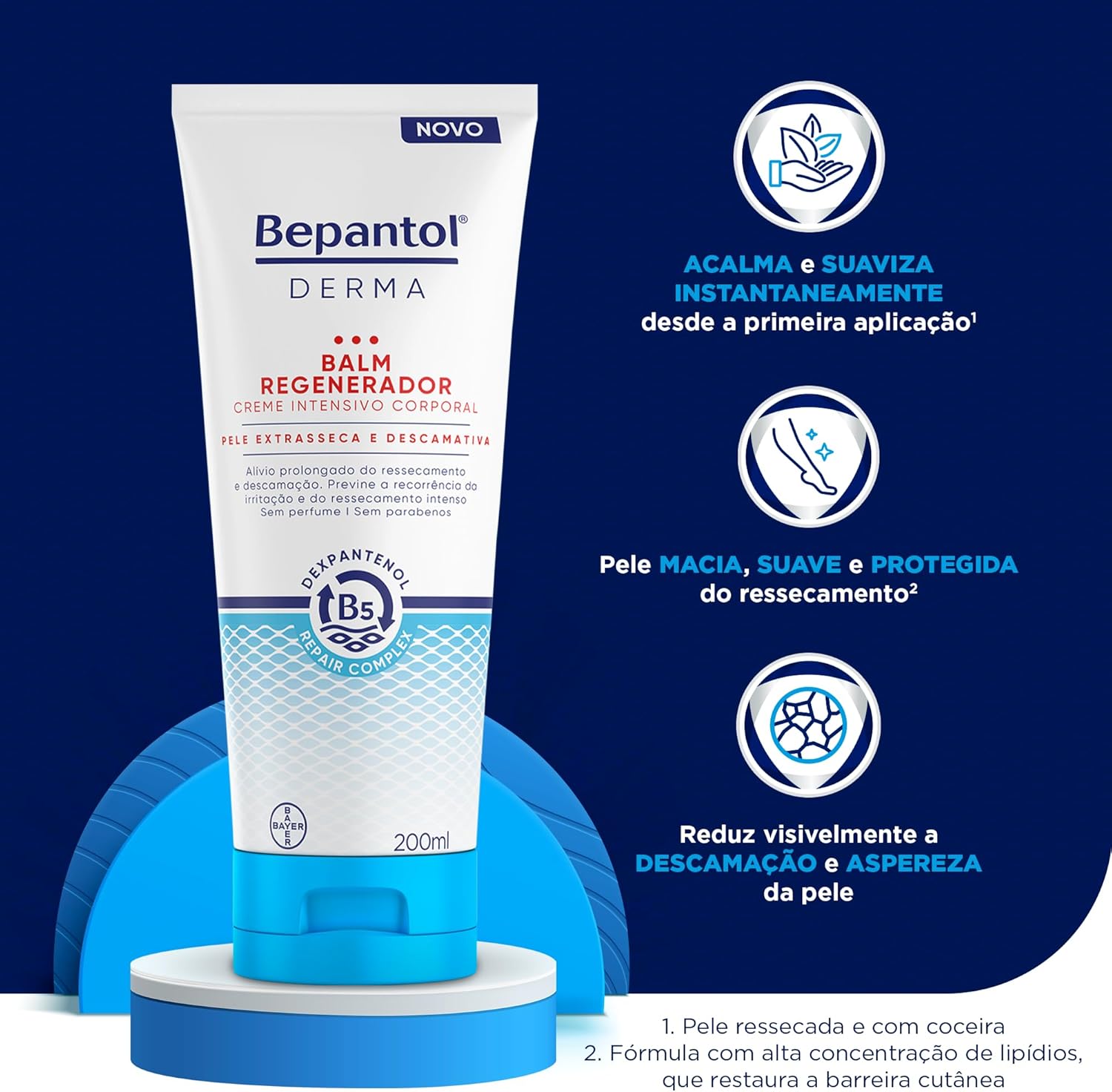 O novo Bepantol Derma Balm Regenerador 200ml oferece uma hidratação intensa, com alívio imediato e prolongado do ressecamento. Sua formulação contém o novo Dexpantenol Repair Complex, que restaura a pele de dentro para fora. O creme de hidratação Bepantol Regenerador é um hidratante corporal, que foi desenvolvido para hidratar e proteger a pele seca e descamativa. Ele é um bálsamo creme corporal que contém ingredientes nutritivos e hidratantes, como o Dexpantenol, a Niacinamida, a Glicerina, o Isoestearato Isopropílico, o Óleo de argan e a manteiga de karité. Com uma formulação exclusiva, a linha Bepantol Derma hidratante contém uma combinação única de ingredientes que atuam nas causas da pele seca, restaurando a pele de dentro para fora. O creme corporal é recomendado para uso diário em pele extrasseca e descamativa, proporcionando alívio imediato e deixando a pele com uma sensação confortável, suave e macia. Com o creme de hidratação Bepantol Balm Regenerador, a pele fica protegida da recorrência do ressecamento e da irritação, prevenindo a descamação e mantendo a pele sempre hidratada e saudável. Combine o hidratante corporal com um hidratante facial para uma rotina de skincare completa.